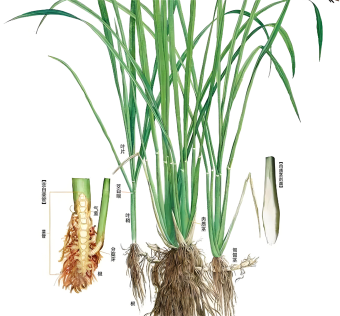 随着生长,当菰草受到菰黑粉菌的寄生侵染后,植株的生长方向发生改变,原本用于开花结籽的营养开始向茎部集中,茎部细胞不断分裂、膨大,最终形成可供食用的肉质茎。